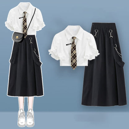 Chic Pocket Lapel Tie T-Shirt Suspender Skirt Set