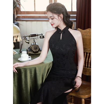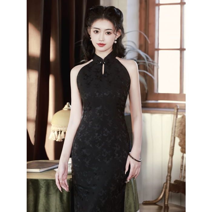 This elegant black sleeveless long cheongsam is perfect for a formal occasion. With its classic design, it exudes sophistication and allows for comfortable movement. A must-have for any fashion-forward individual.