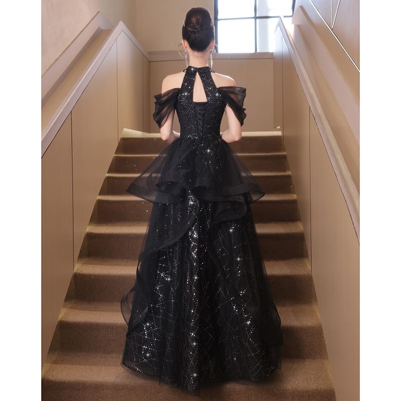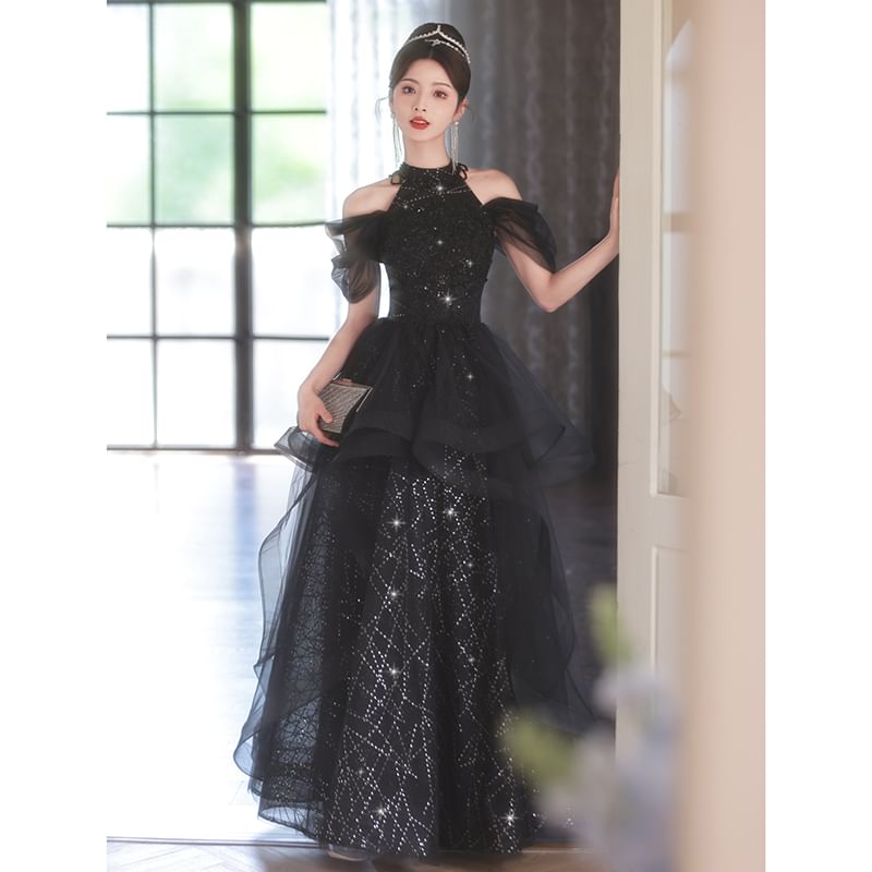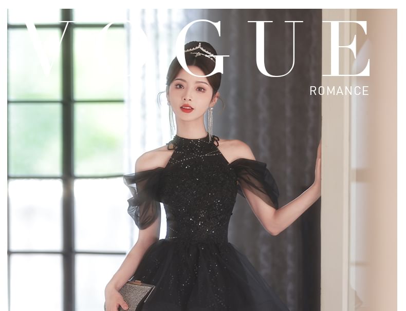 Cold Shoulder Sequin Mesh A-Line Evening Gown