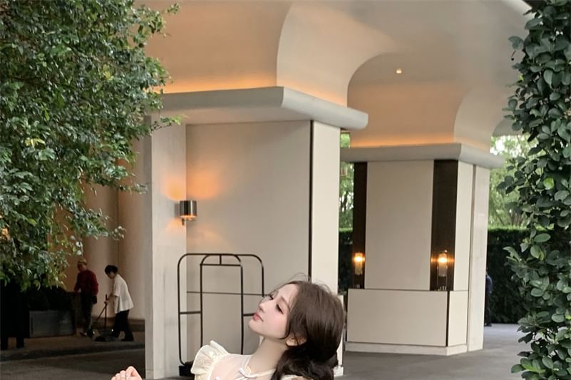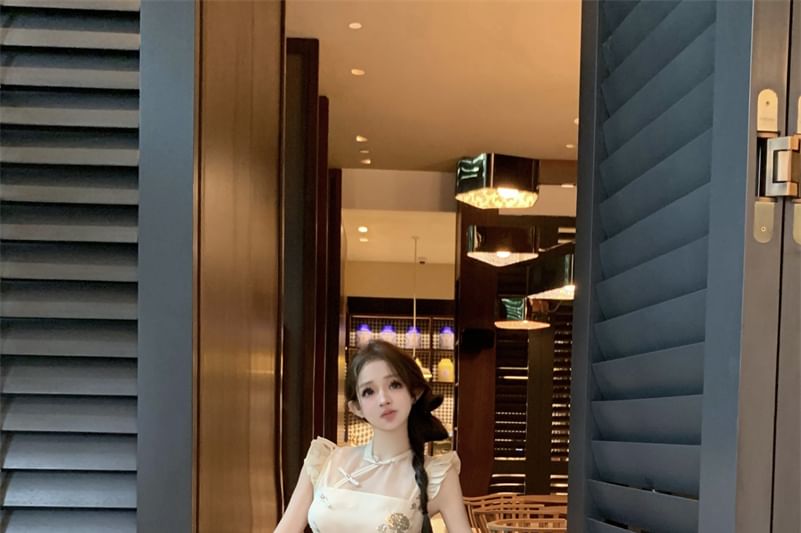 Collar Pants Buttoned Plain Embroidered Top Tube Cap-Sleeve Floral / Leg Frog Crop Wide Rise Slit Stand Set High