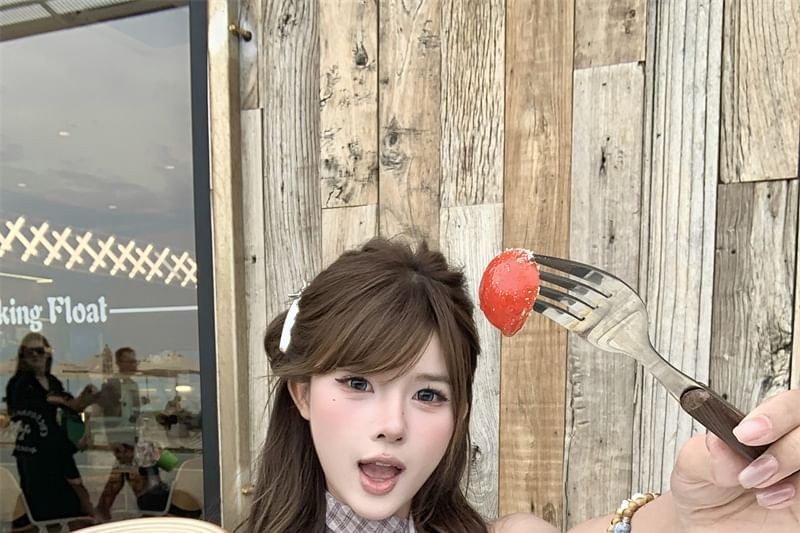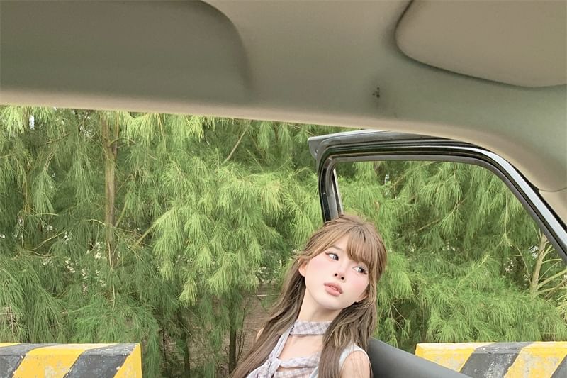 Cowl Neck Top Piece Sleeveless Mock Plaid Two