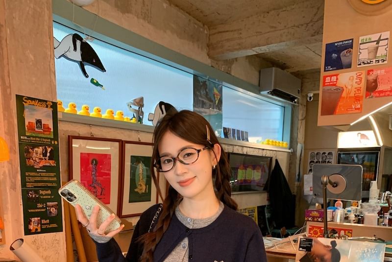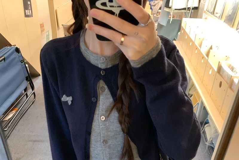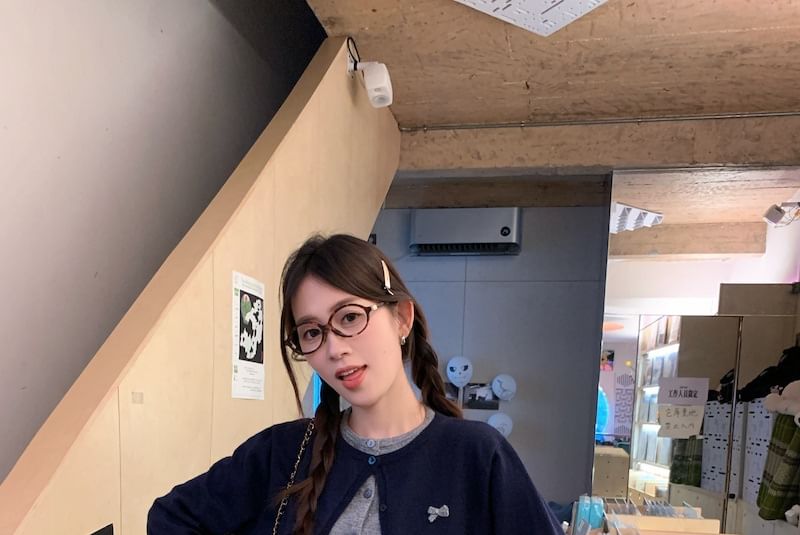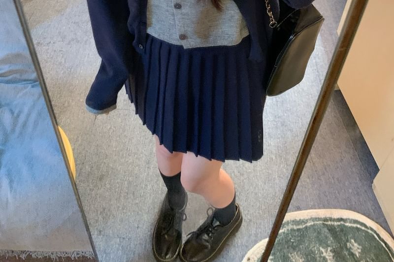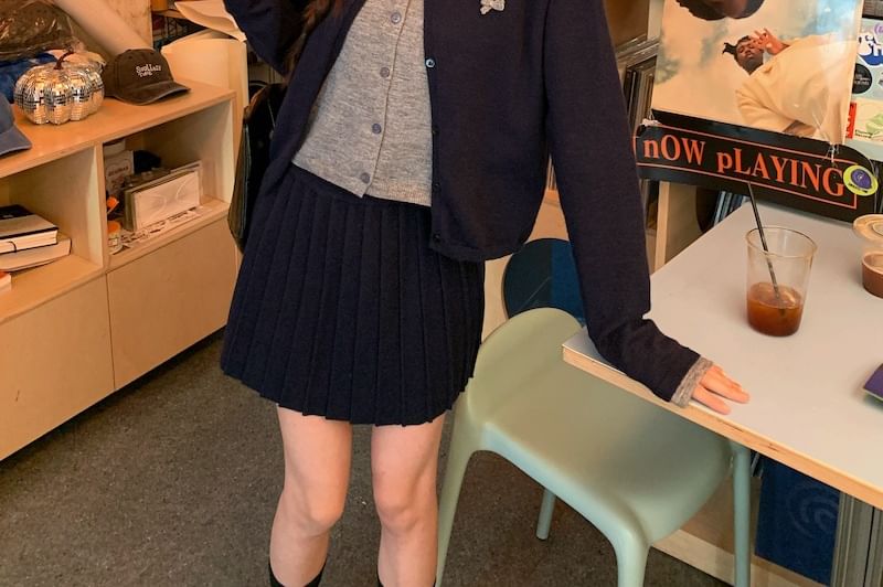 Crew Neck Mock Two-Piece Two Tone Bow Accent Button-Up Crop Cardigan / High Waist Plain Pleated Mini A-Line Skirt