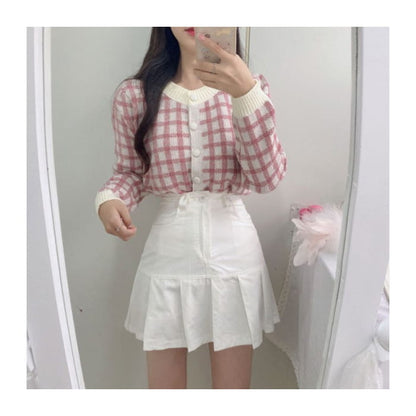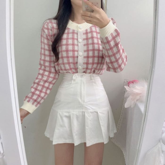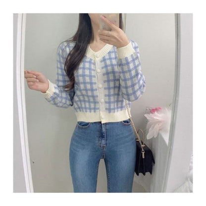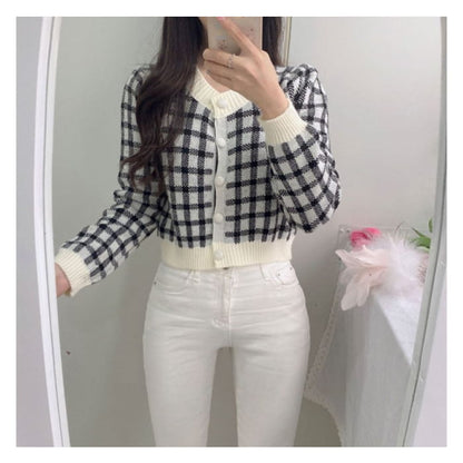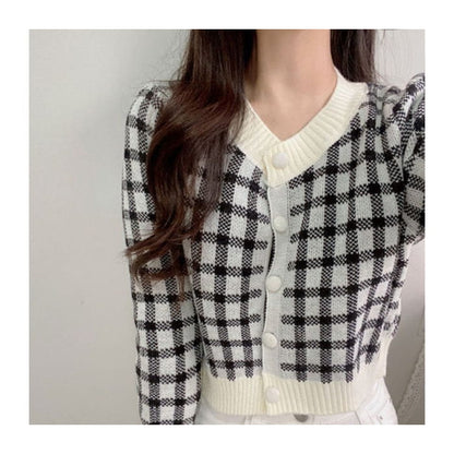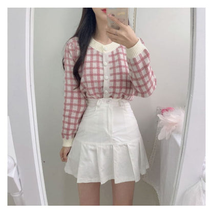 Crew Neck Plaid Cardigan