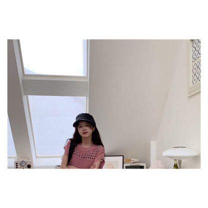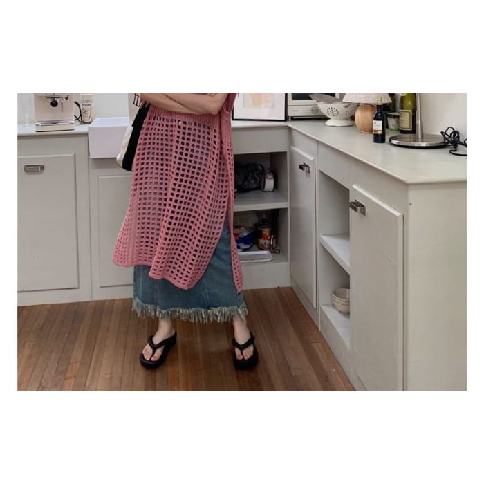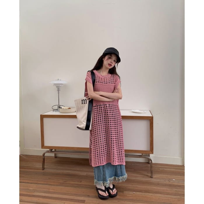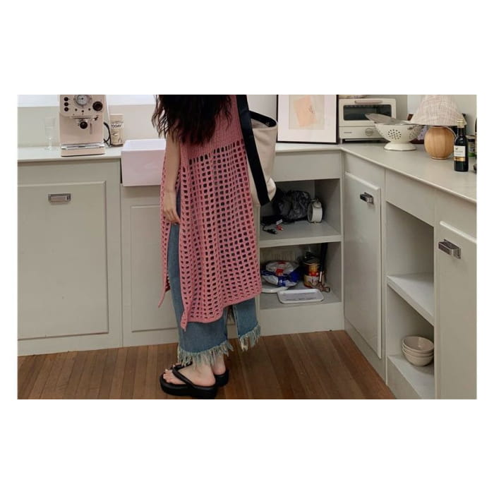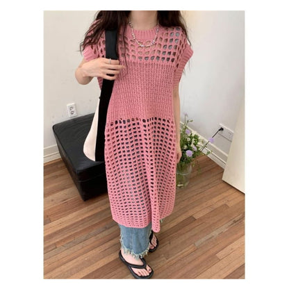 Crew Neck Plain Slit Crochet Long Sweater Vest