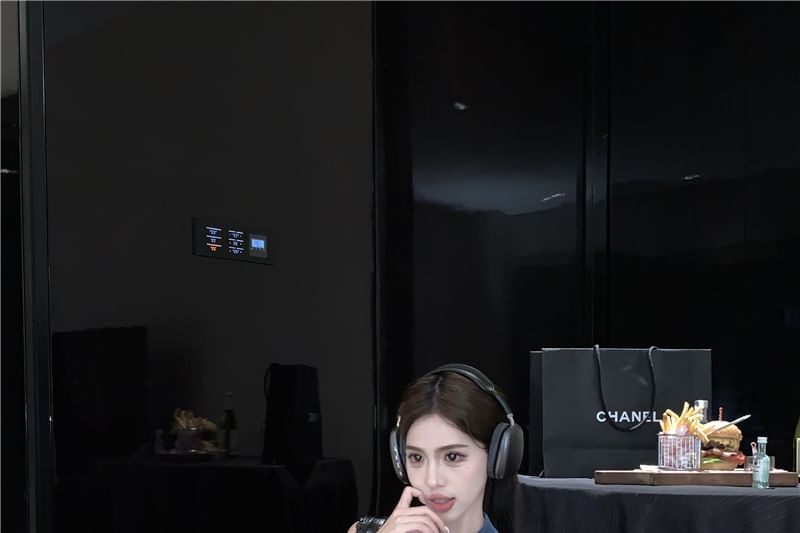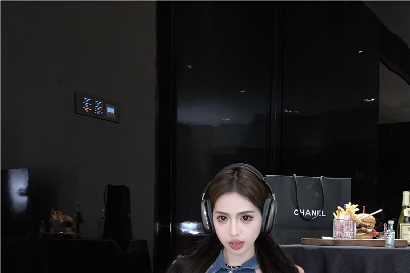 Crop Collared Button Pencil Skirt Waist High Vest Washed / Denim Mini