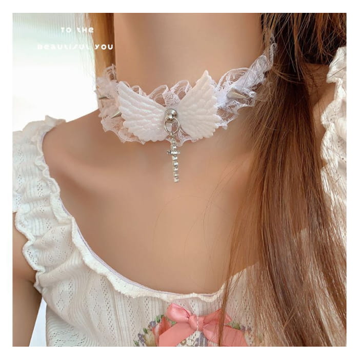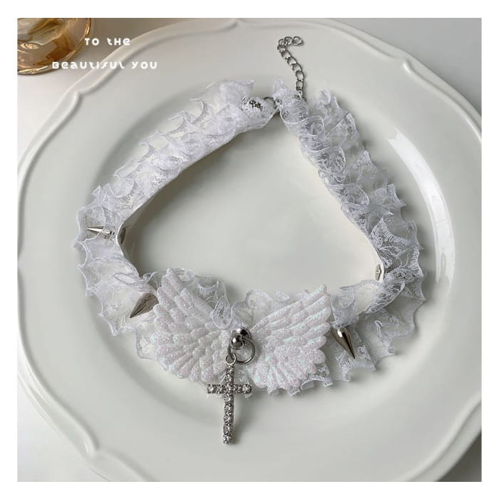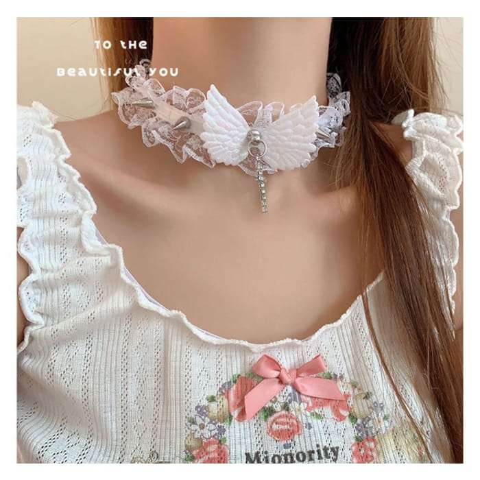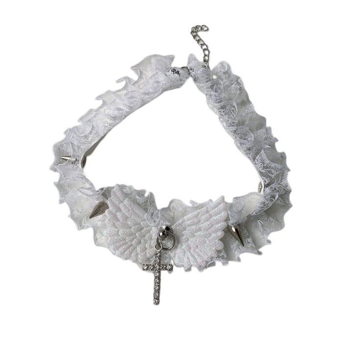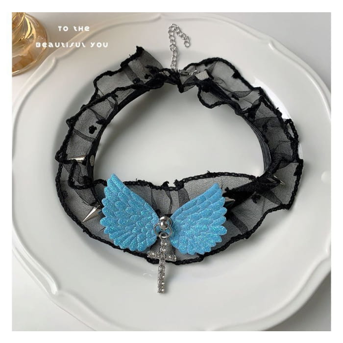 Cross Rhinestone Wing Pendant Studded Lace Choker