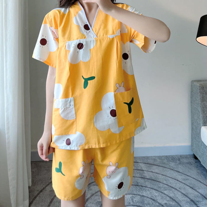 This cute flowers print V-neck t-shirt and shorts pajamas set is perfect for your relaxing nights. The soft and breathable fabric ensures maximum comfort while the elegant design will make you feel stylish and beautiful. Get a good night's sleep with this lovely pajama set.
