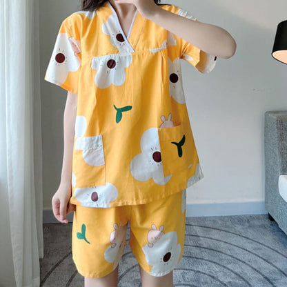 Cute Flowers Print V-Neck T-Shirt Shorts Pajamas Set