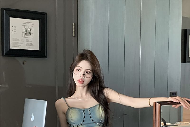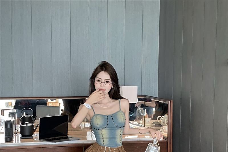 Studded Washed Denim Cami Top / High Rise Plain Asymmetrical Mini A-Line Skirt