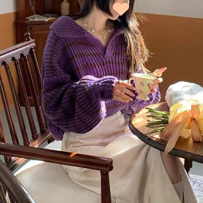 Dolman-Sleeve Striped Polo Sweater