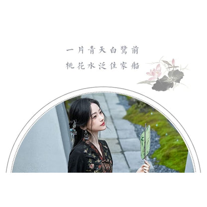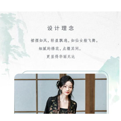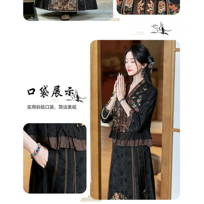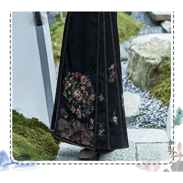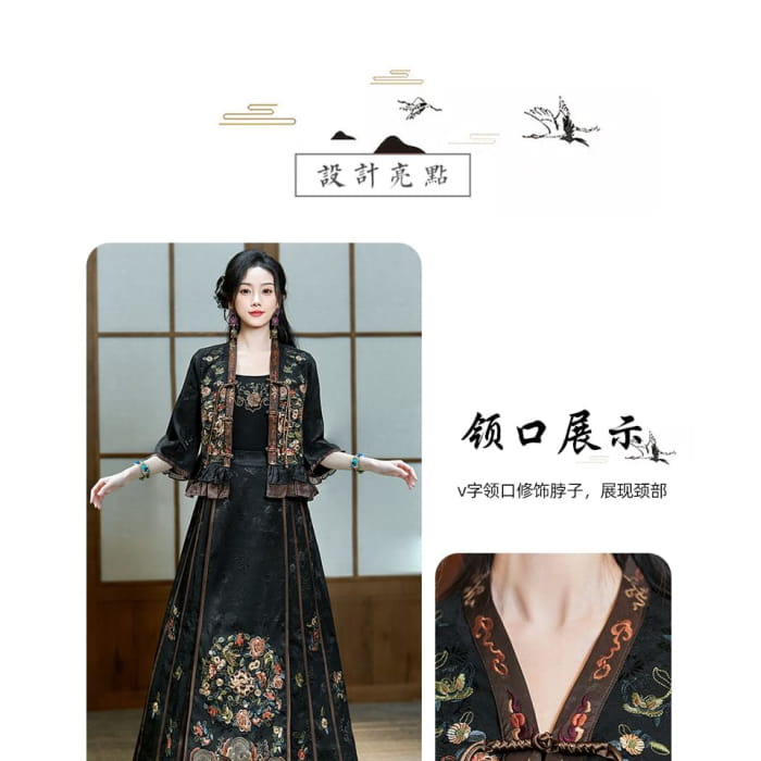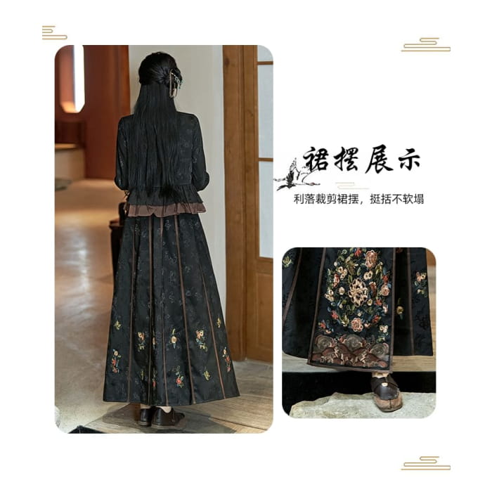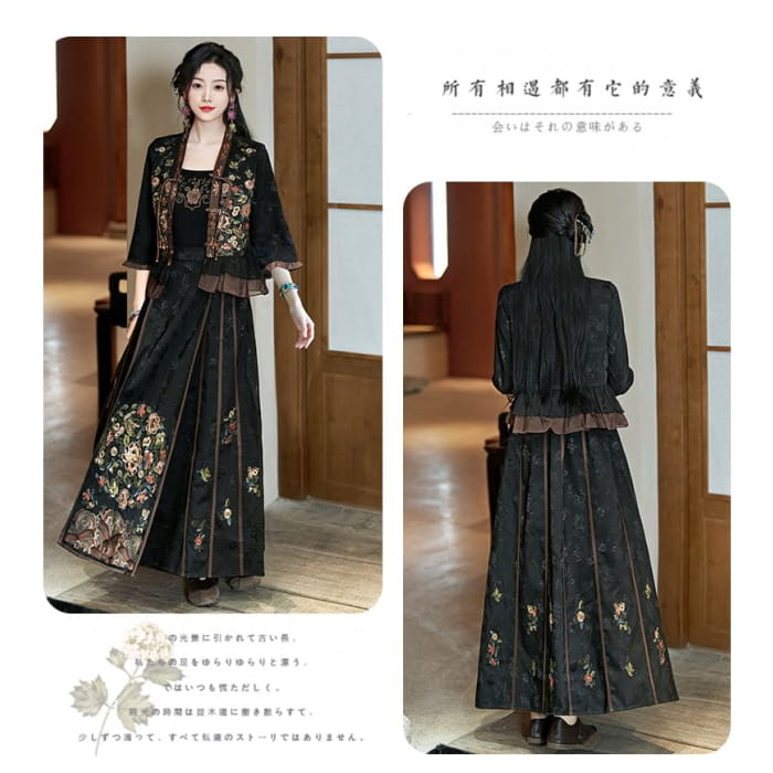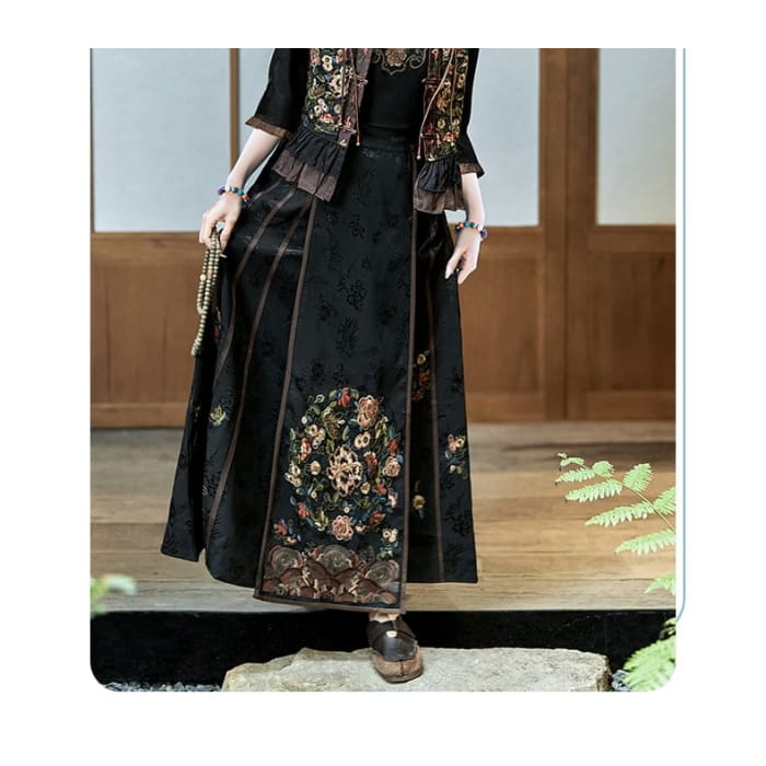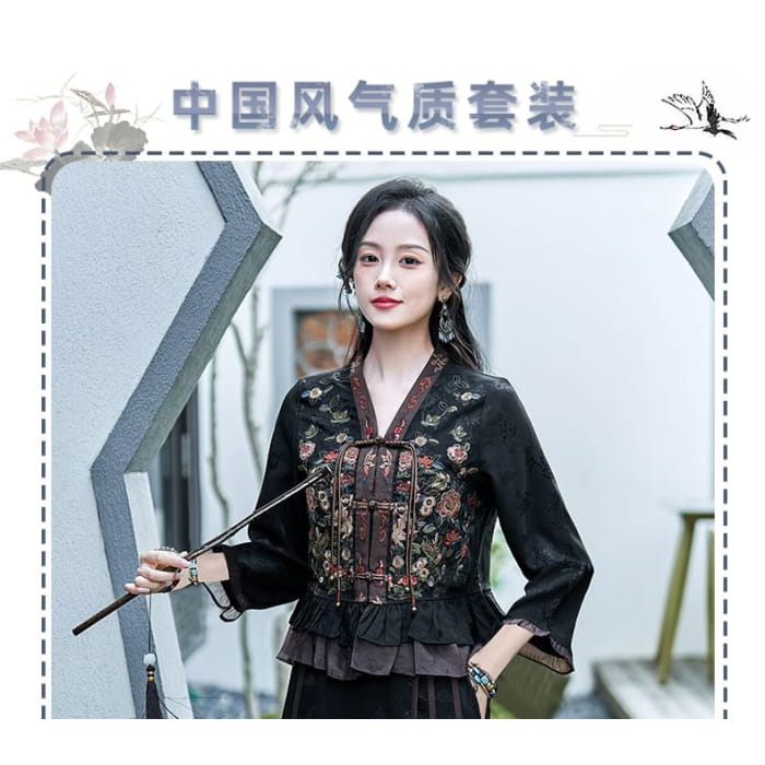Elbow-Sleeve V-Neck Floral Embroidered Peplum Frog Closure Blouse / High Waist Panel Maxi A-Line Skirt / Camisole Top