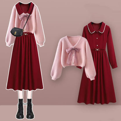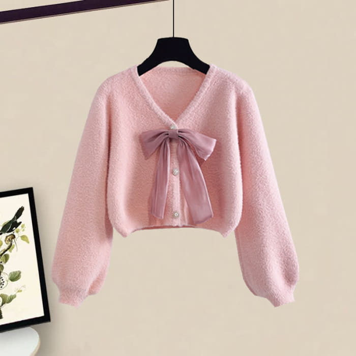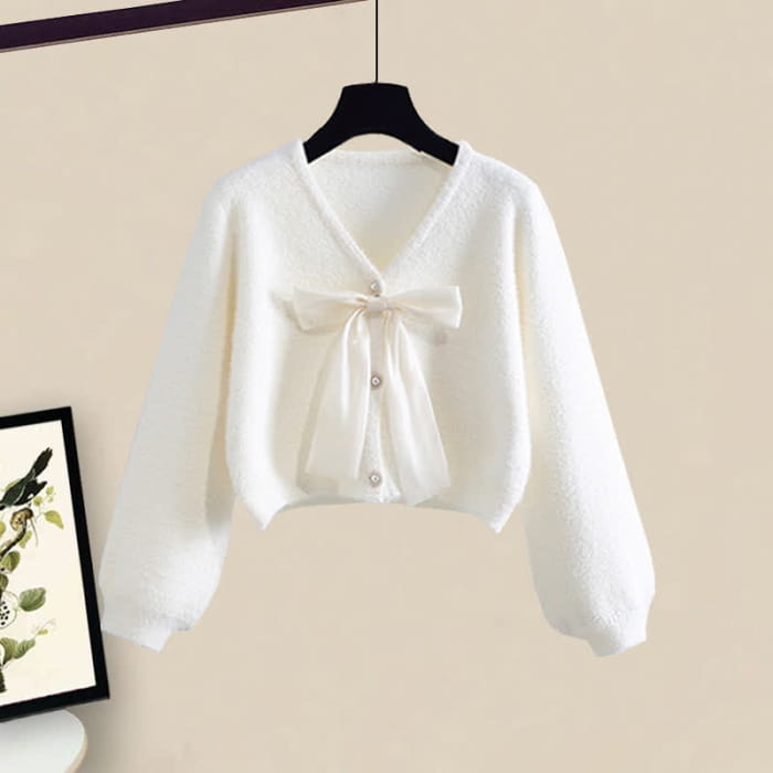 Elegant Bow Knot Cardigan Crop Sweater Long Sleeve Dress