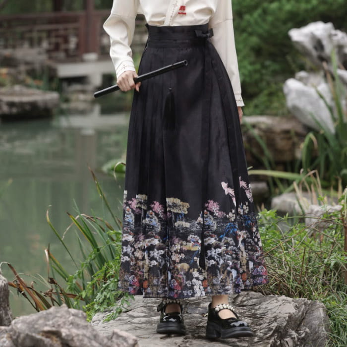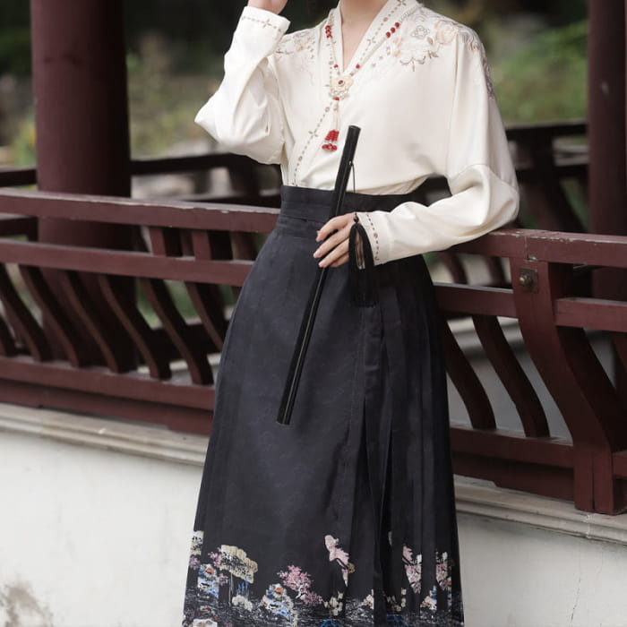 Elegant V-neck Long Sleeve Shirt Vintage Print Pleated Skirt