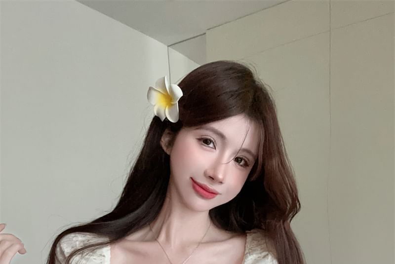 Embroidered Short-Sleeve Square Eyelet Skirt / Lace A-Line Tiered Rise Tie Neck Front High Mini Blouse
