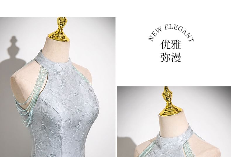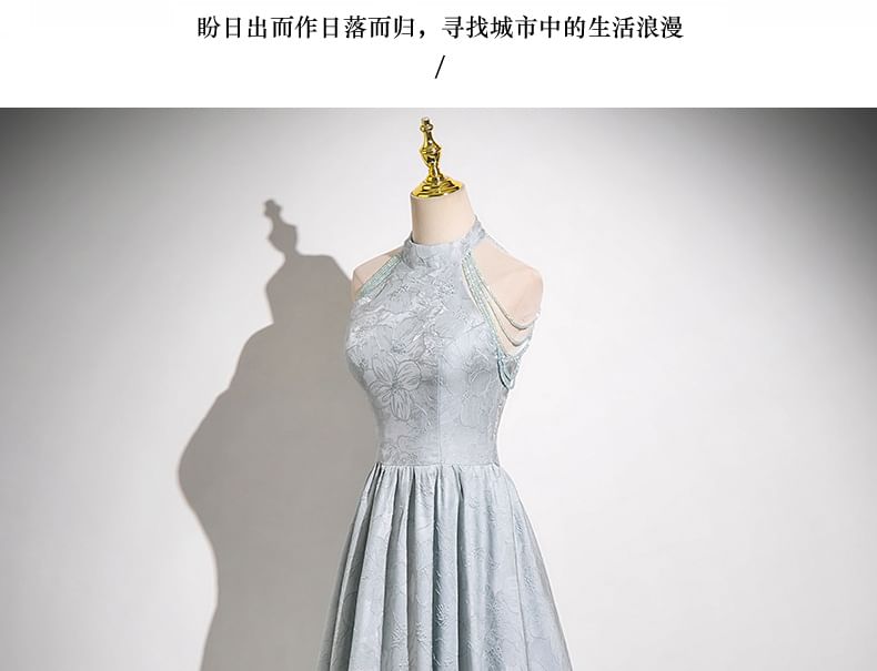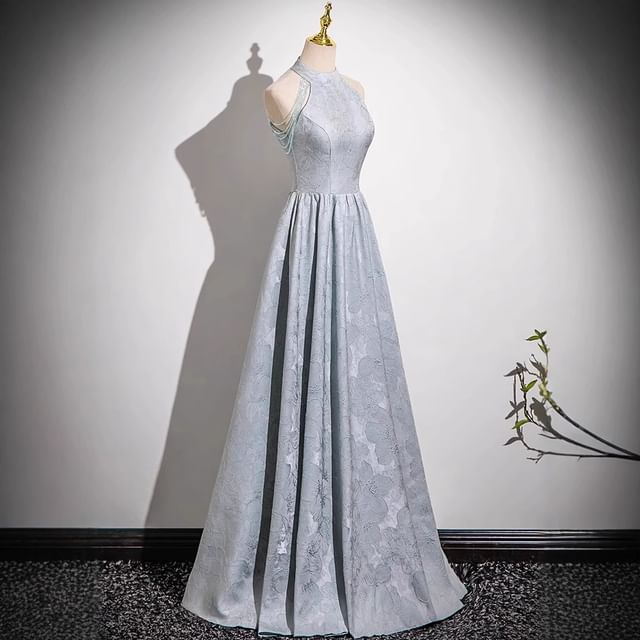 Halter Neck Floral Jacquard Faux Crystal Fringed A-Line Evening Gown