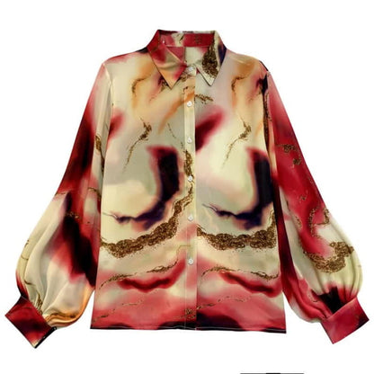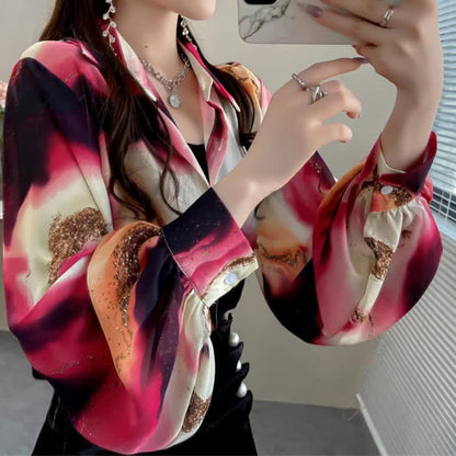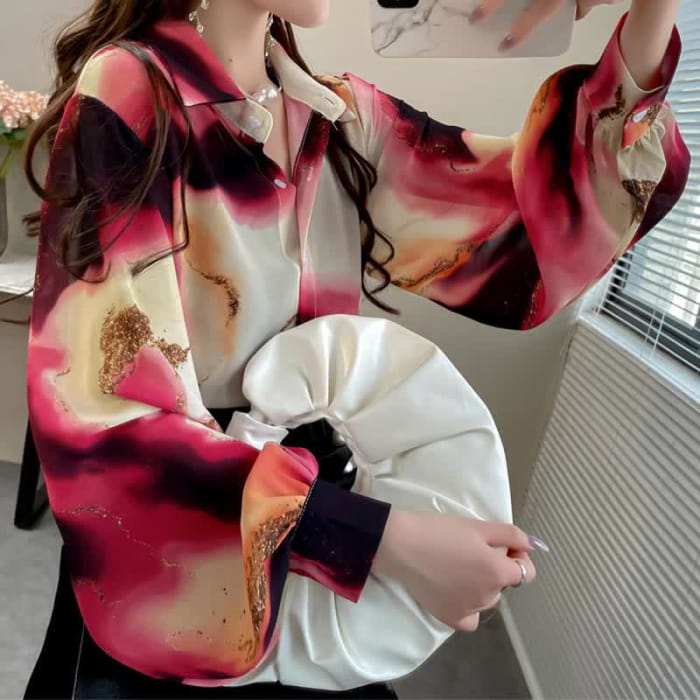 Fashion Colorblock Tie-dye Print Puff Sleeve Shirt