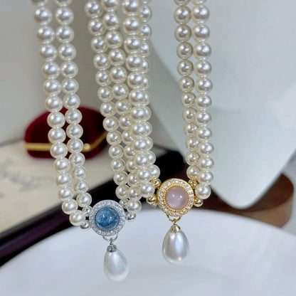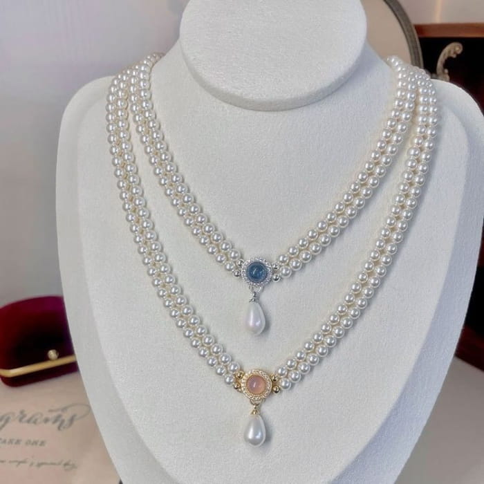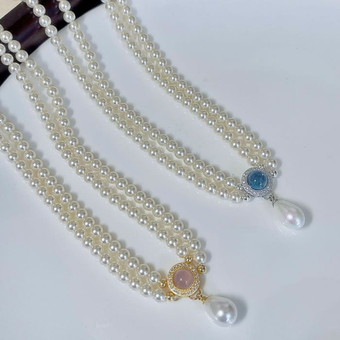 Faux Gemstone Pendant Layered Faux Pearl Necklace