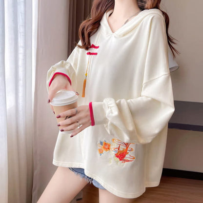 Floral Carp Embroidery Buckle Tassel Loose Hoodie