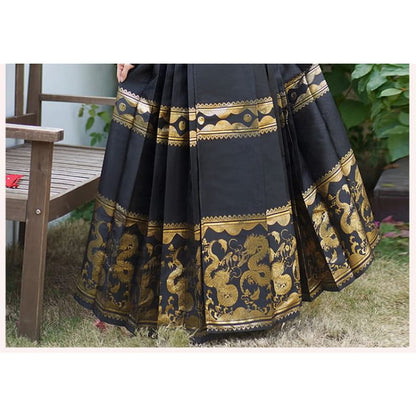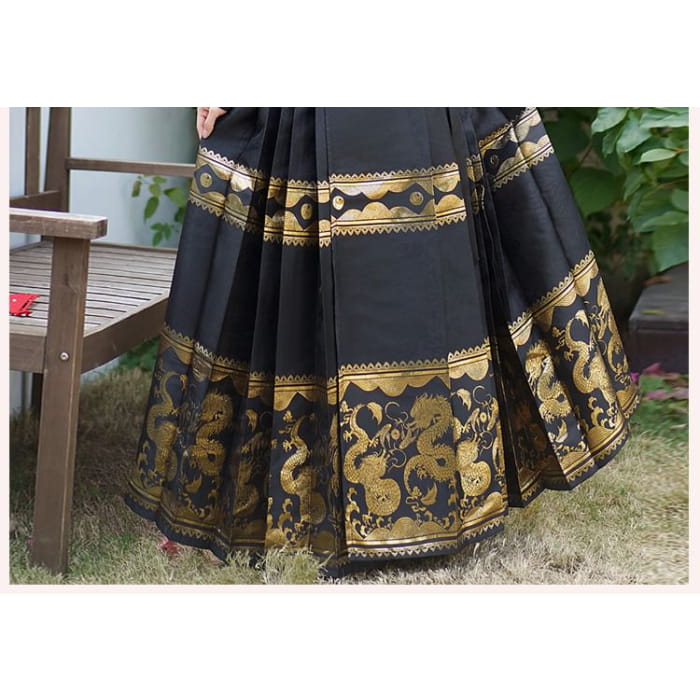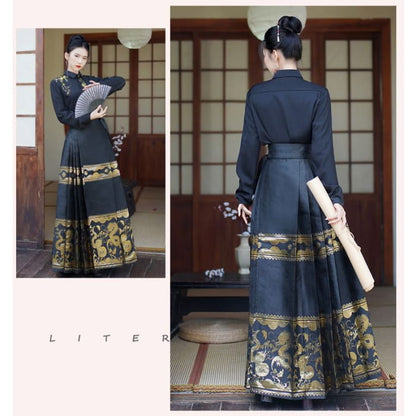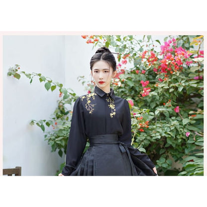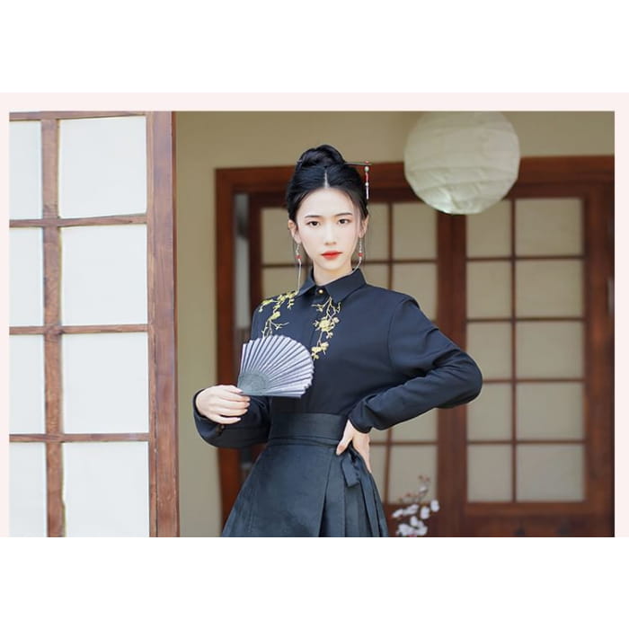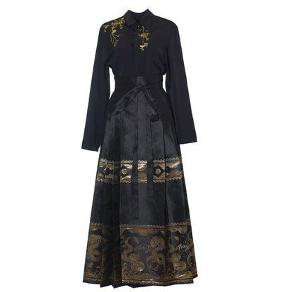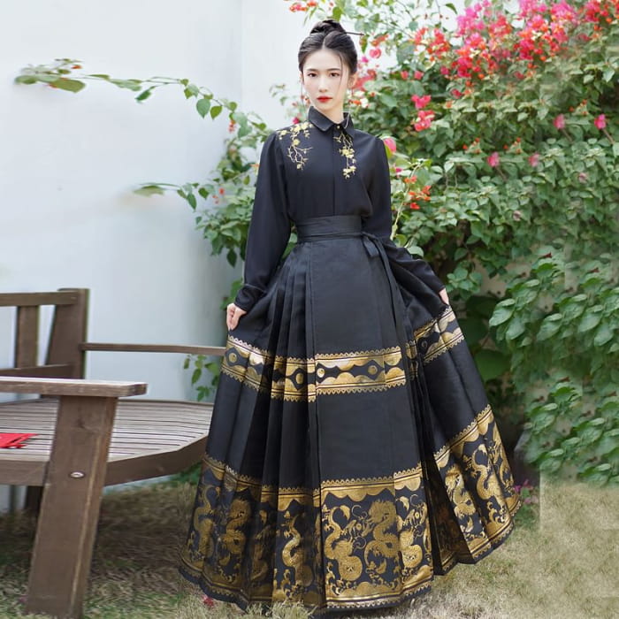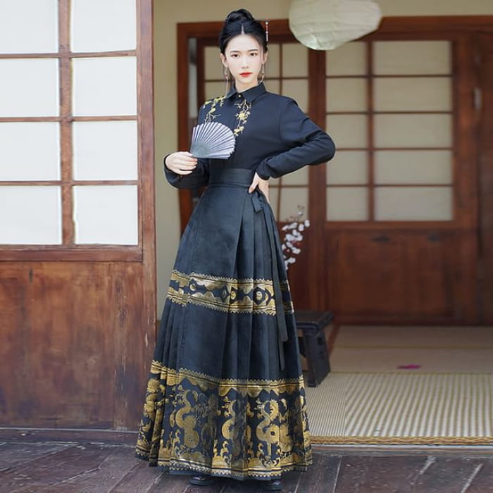 Flower Embroidered Shirt / High Rise Dragon Print Maxi Ma Mian Skirt / Arm Sleeves