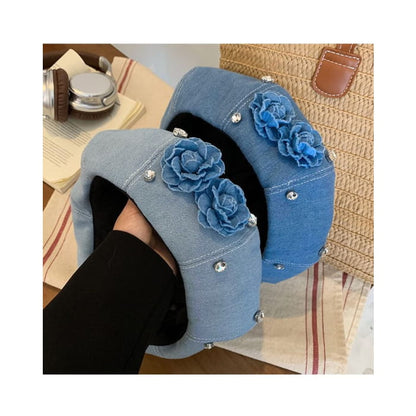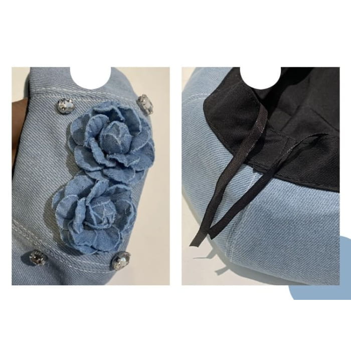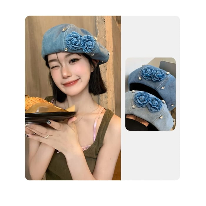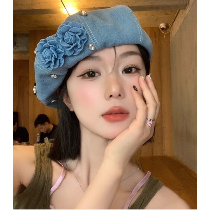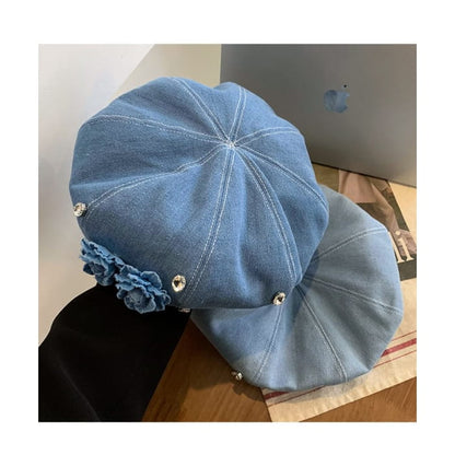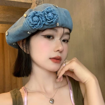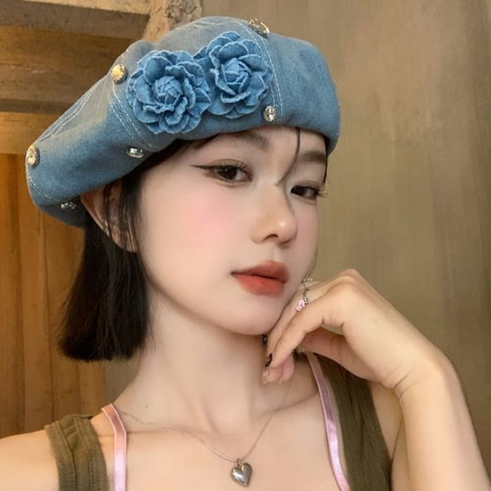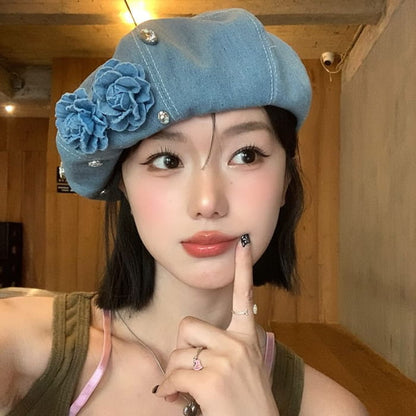 Flower Rhinestone Denim Beret
