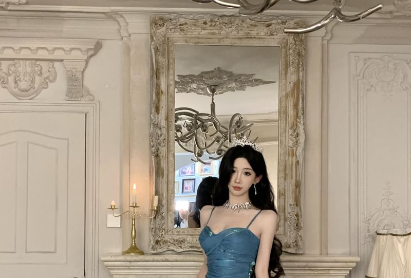 Spaghetti Strap Plain Glitter A-Line Evening Gown