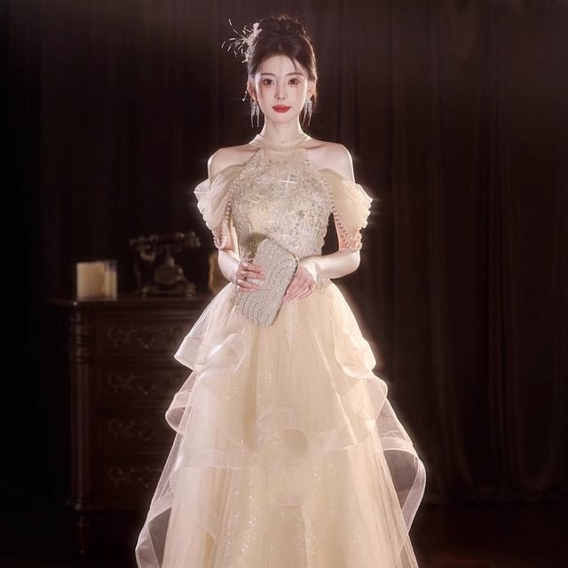 Off-Shoulder Sequin Bead A-Line Evening Gown