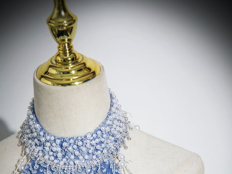 Gown Sleeveless Mock Patterned Beaded Evening A-Line Neck Mesh
