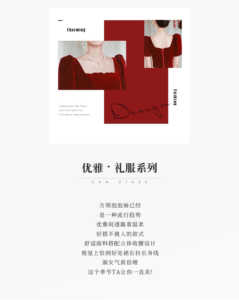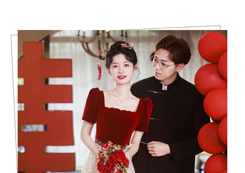 Short-Sleeve Square Neck Sequin Panel A-Line Evening Gown