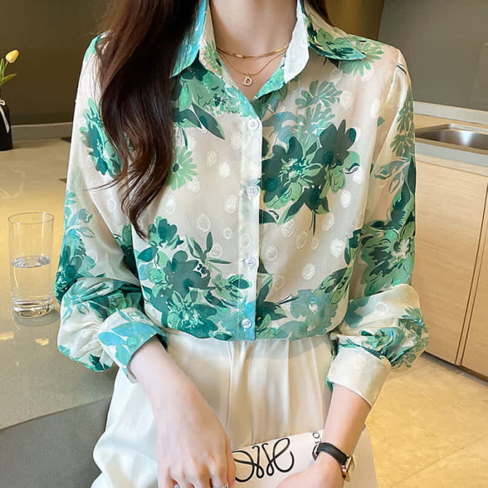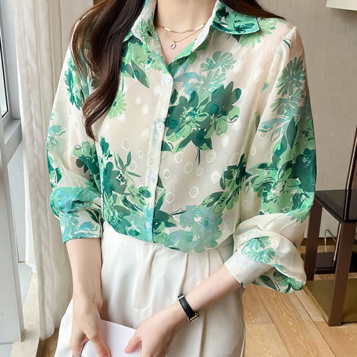 Green Floral Print Puff Sleeve Chiffon Shirt