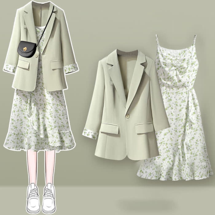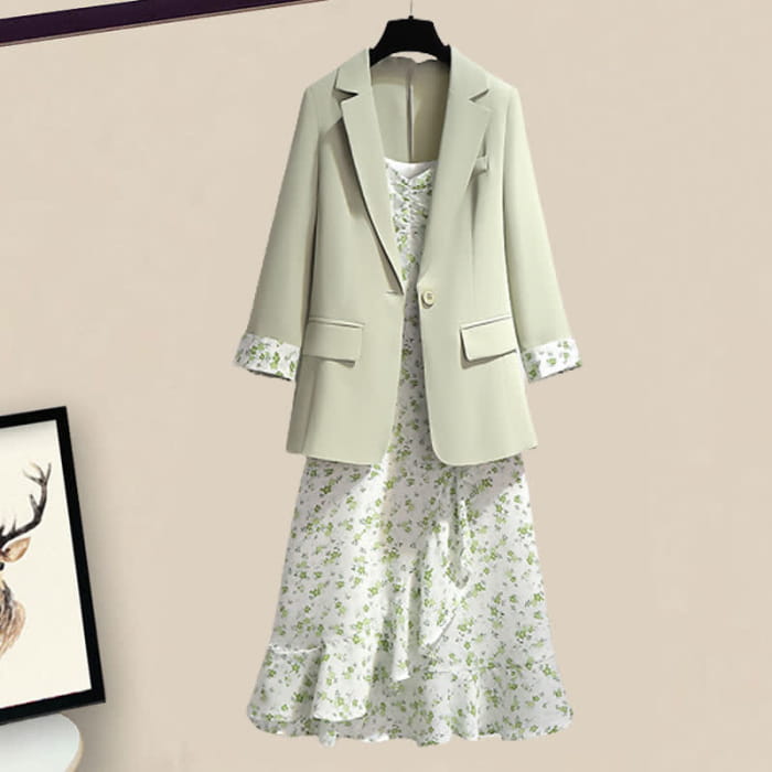 Green Floral Print Slip Dress Set