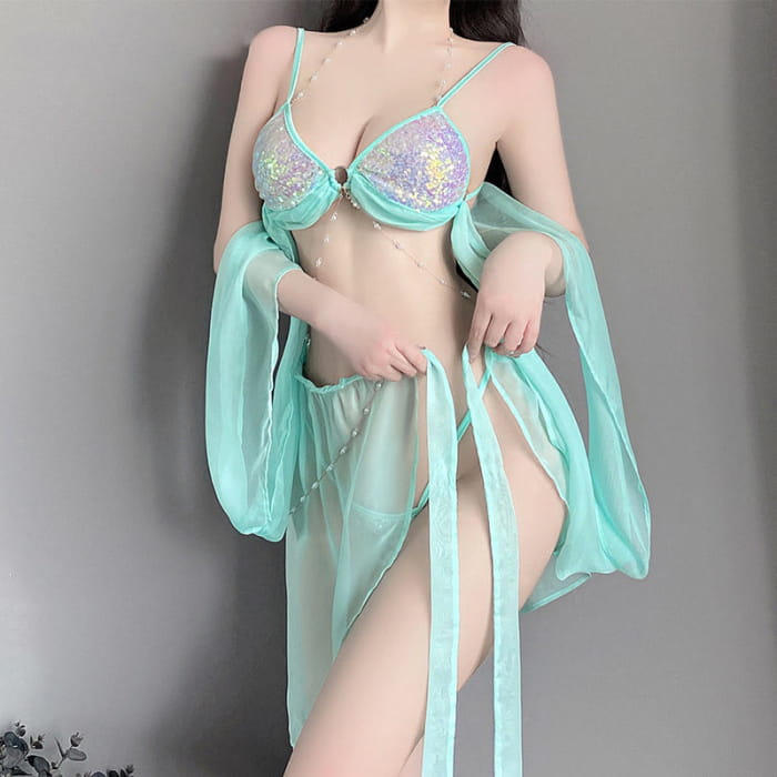 Green Mermaid Sequins Bra Mesh See-through Skirt Lingerie