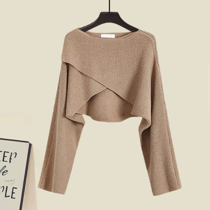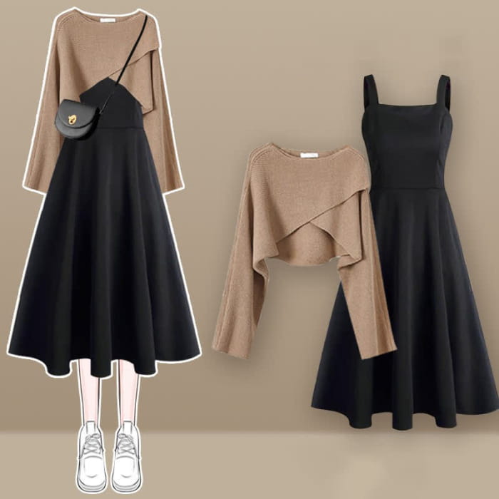 Grey Cardigan Cross Knit Sweater Lace Up Slip Dress Set