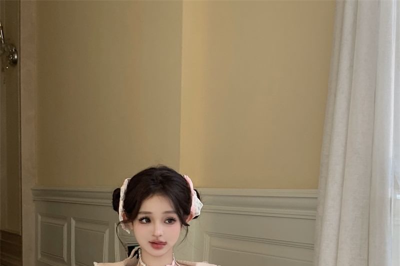 Half Neck Set Rise Accent Tiered Mock Bow Crop Plain / Apron Top High Trim Long-Sleeve Skirt Two-Piece Knit Lace Halter A-Line Mini