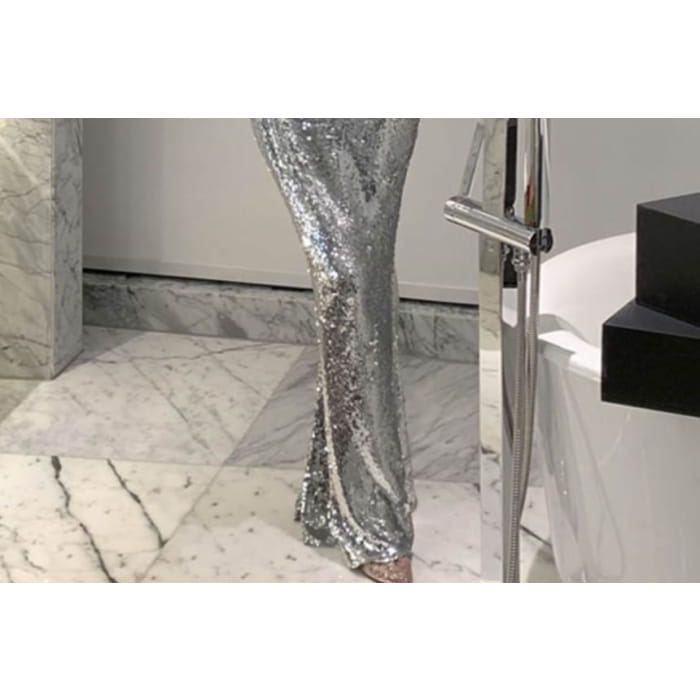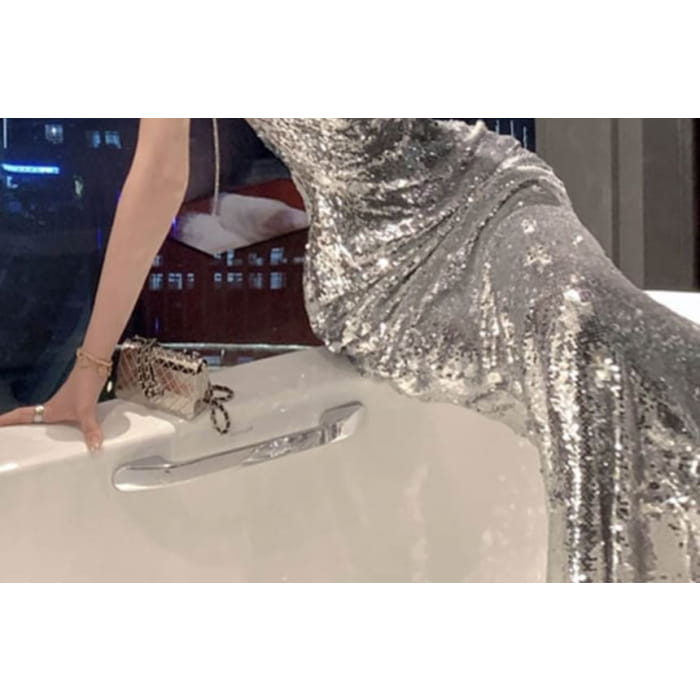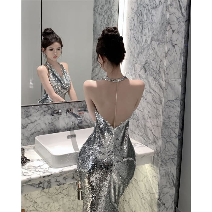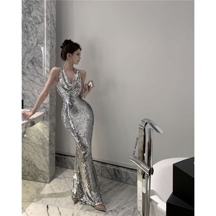 Halter Neck Plain Sequin Mermaid Evening Gown