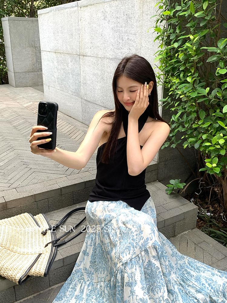 Halter Neck Plain Slit Crop Camisole Top
