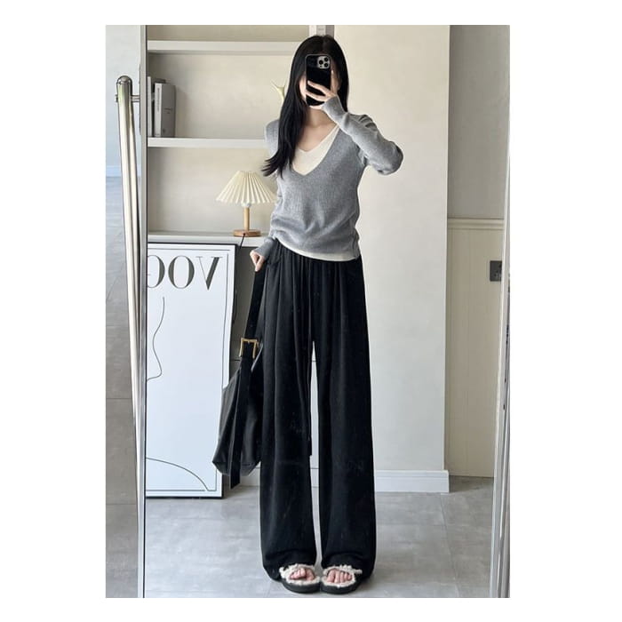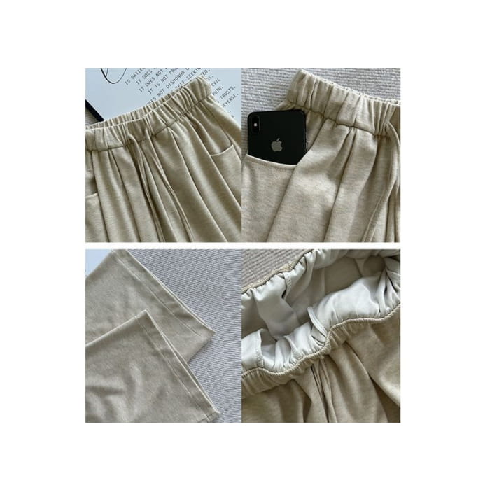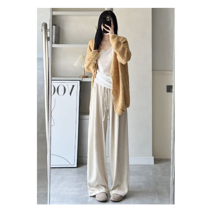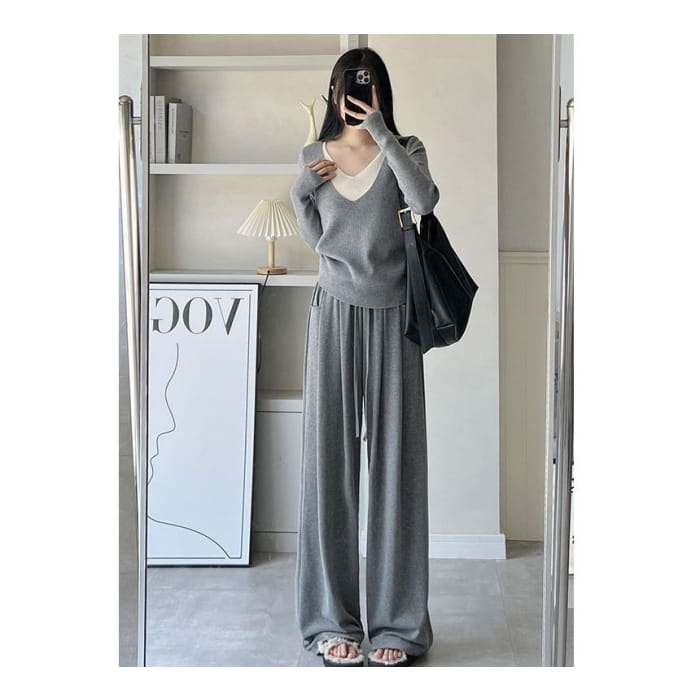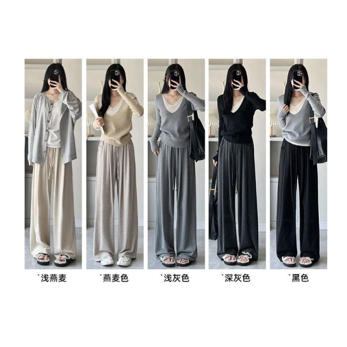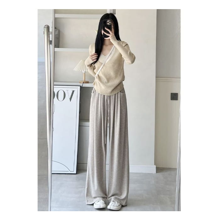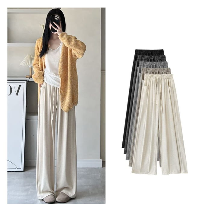 High Rise Drawstring Pocketed Drape Knit Wide Leg Plain Sweatpants