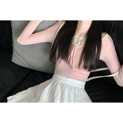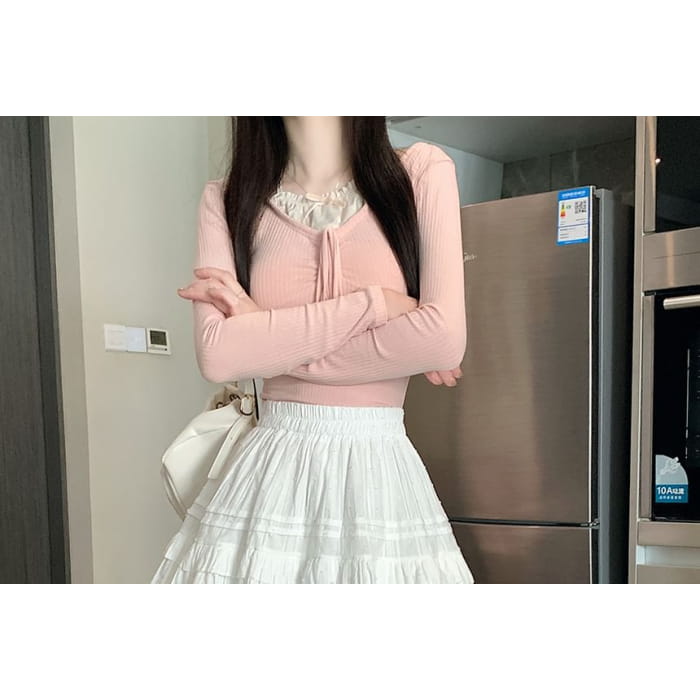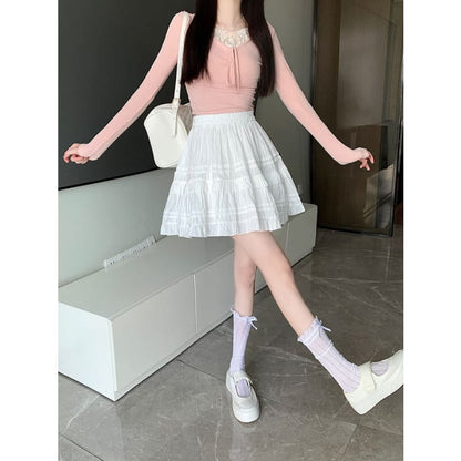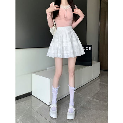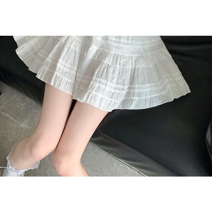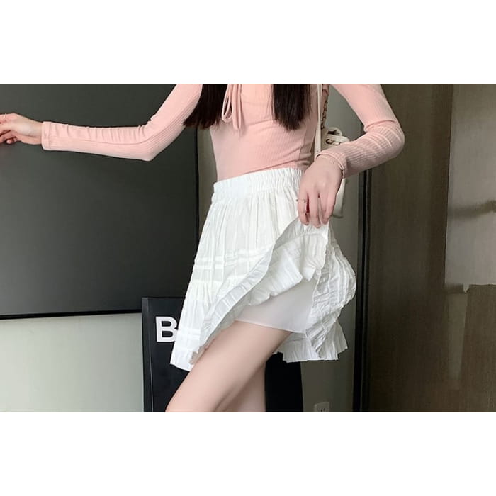 High Waist Plain Frill Trim Pintuck Tiered Mini A-Line Skirt