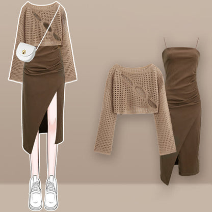 Elevate your style game with our elegant Hollow Out Crop Top Split Slip Dress Set. The intricately designed crop top and split slip dress provide a flattering and chic look, while the hollow out details add a touch of sophistication. Perfect for any occasion, this set will make you stand out in any crowd.