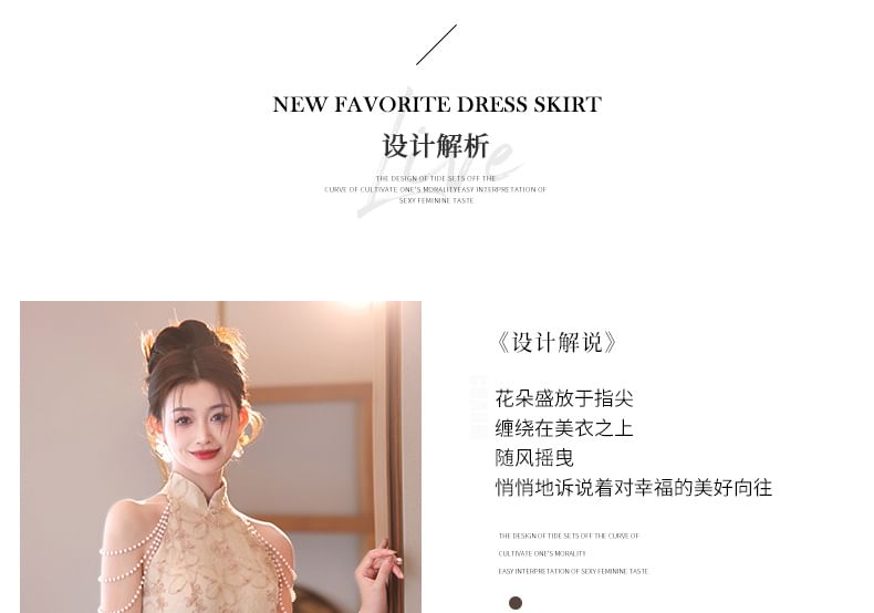 Jacquard Neck Fringed Pearl Collar A-Line Dress Evening Floral Faux Stand Halter