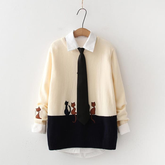 Show off your feline fashion sense with our elegant Kitty Embroidery Sweater Tie Shirt Set. This comfortable and stylish set features adorable kitty embroidery, perfect for adding a touch of elegance and charm to any outfit. Stay cozy and look fabulous with this must-have set.