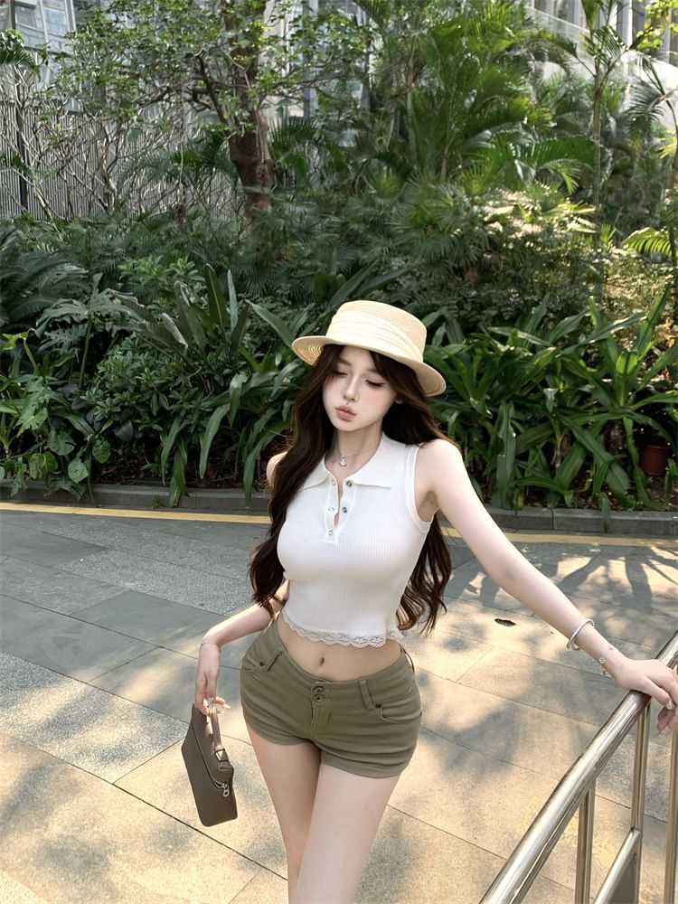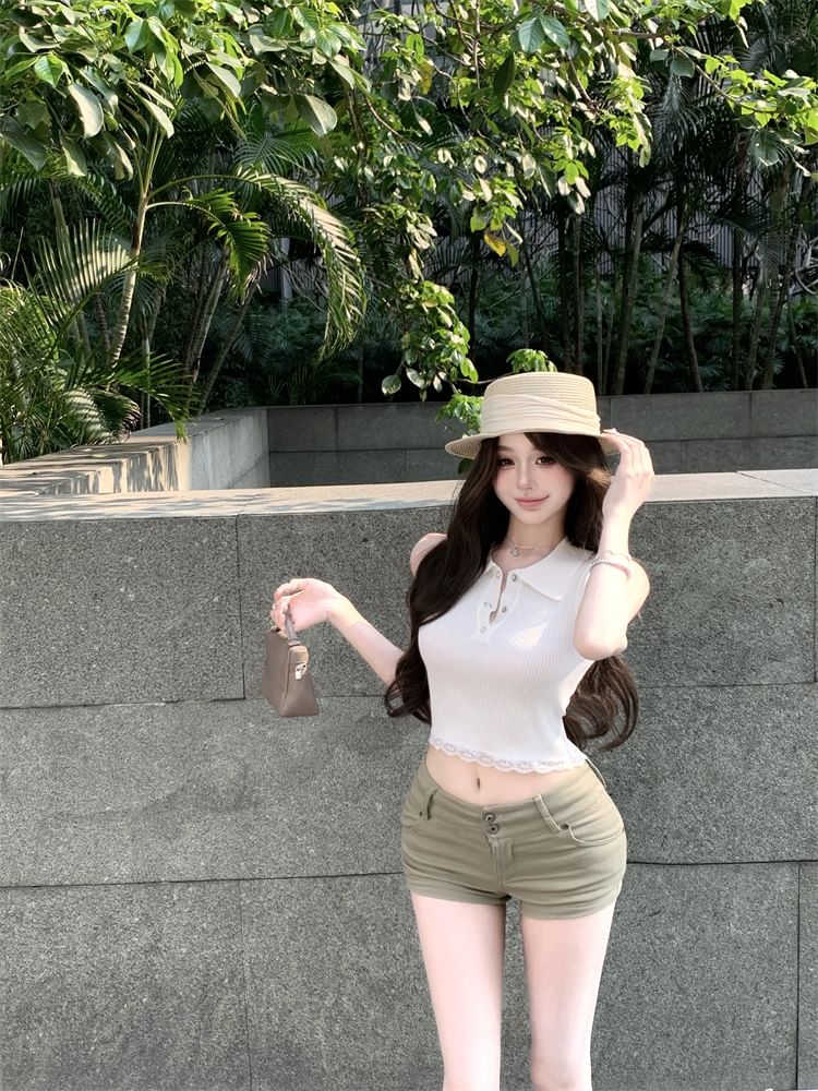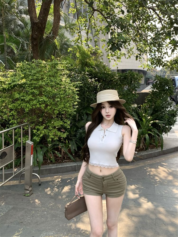Sleeveless Plain Lace Trim Collared Top