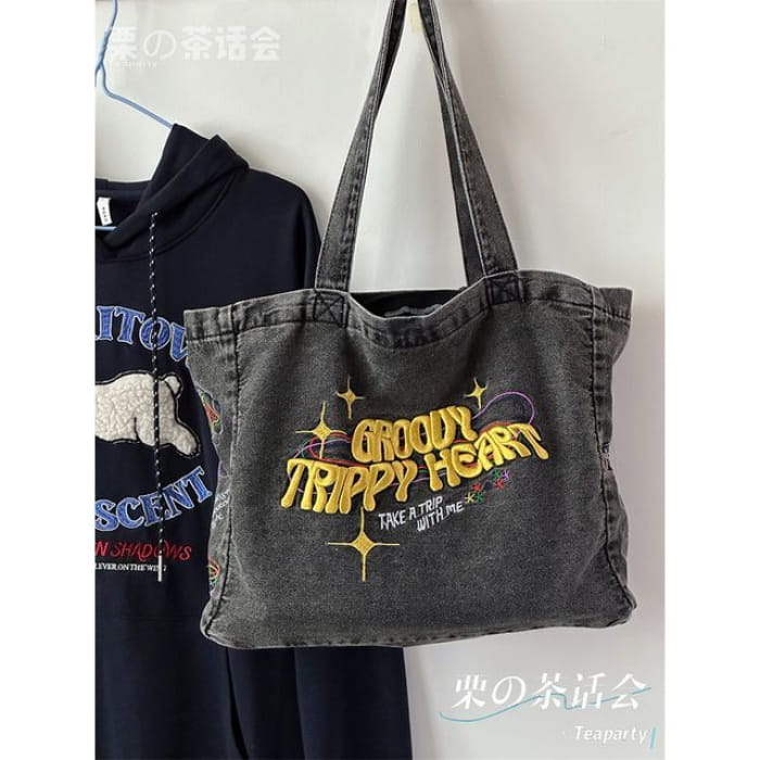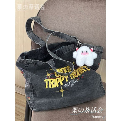 Letter Embroidered Denim Tote Bag / Bag Charm / Set