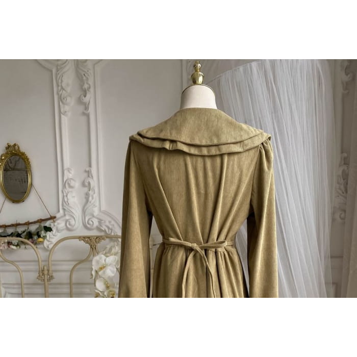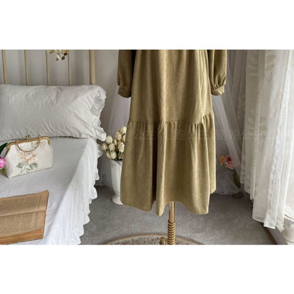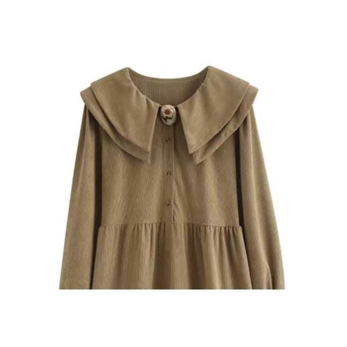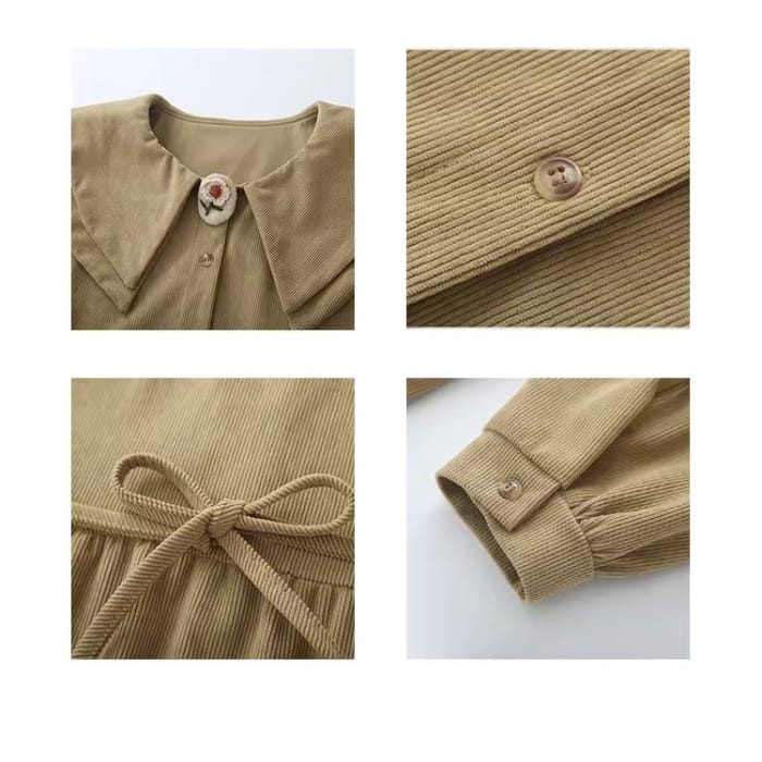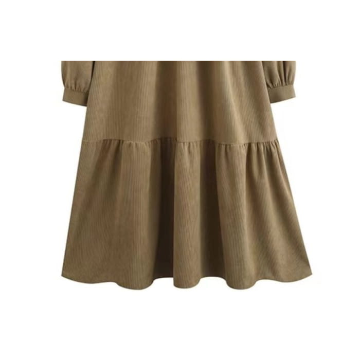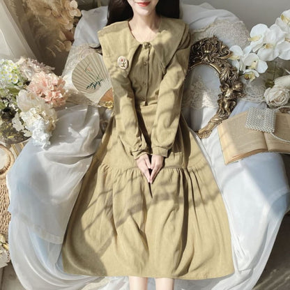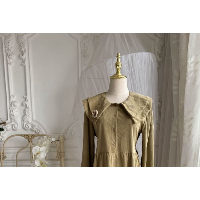 Long-Sleeve Collar Plain Corduroy Midi A-Line Dress