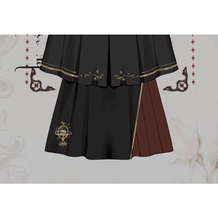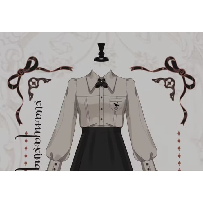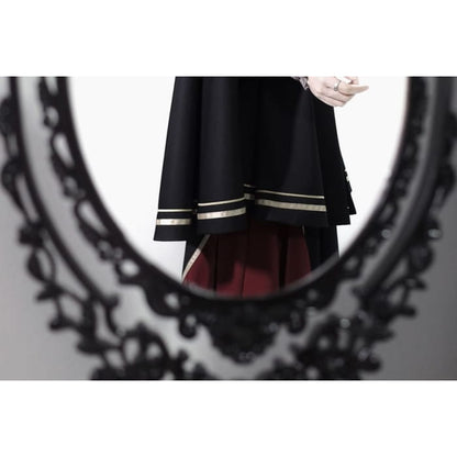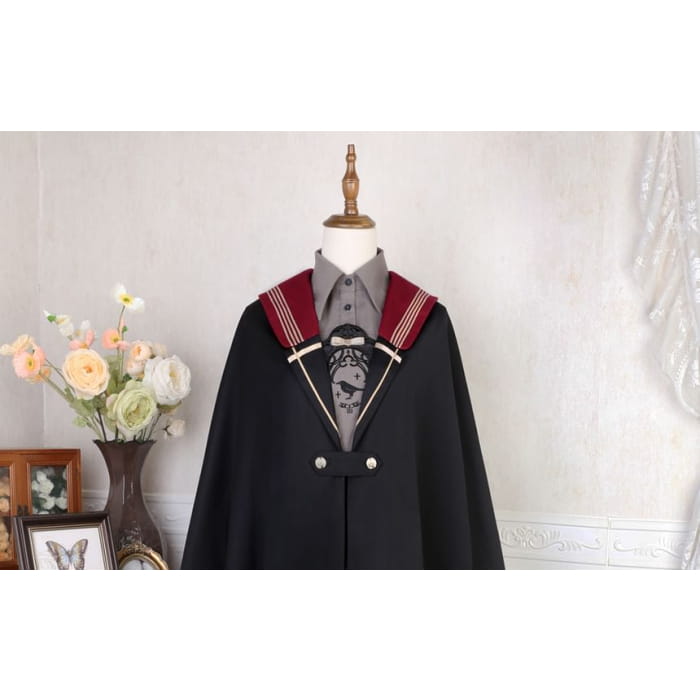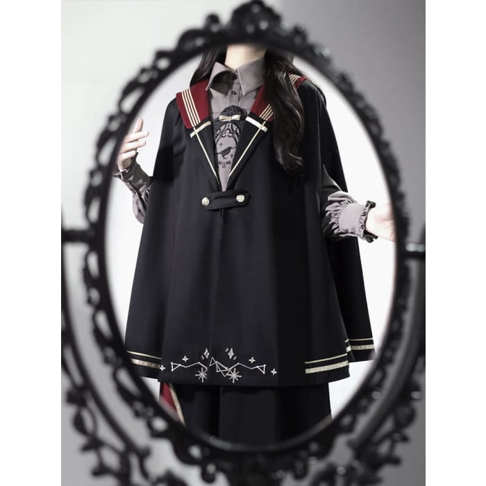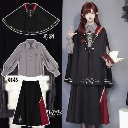 Lolita Long-Sleeve Collared Bird Embroidered Pintuck Shirt / Cape / High Waist Panel Midi A-Line Skirt / Set