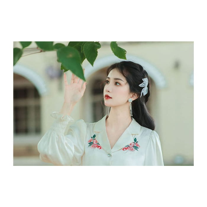 Long-Sleeve Collared Floral Embroidered Blouse / High Waist Plain Pleated Belted Midi A-Line Skirt / Set