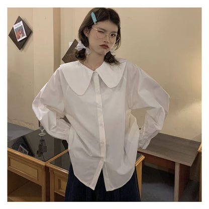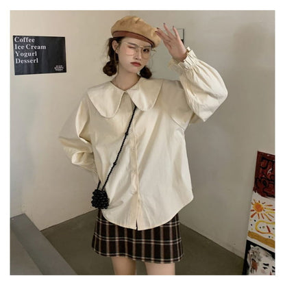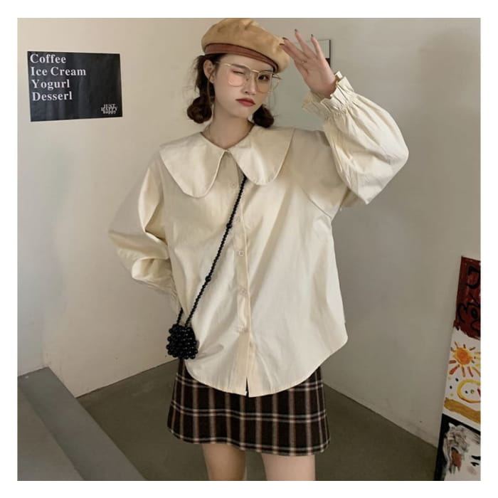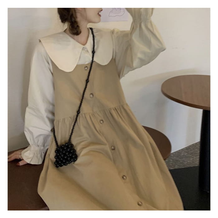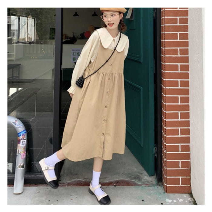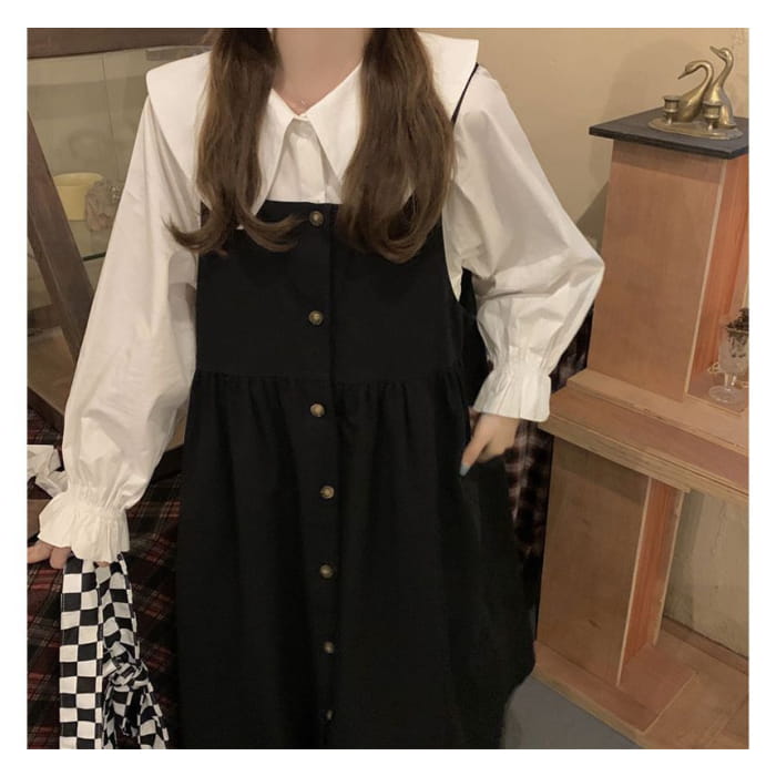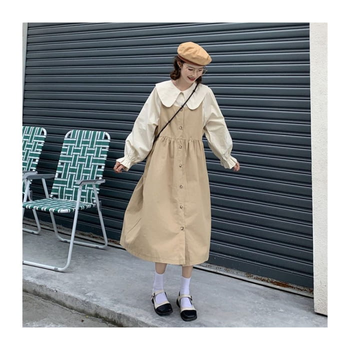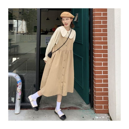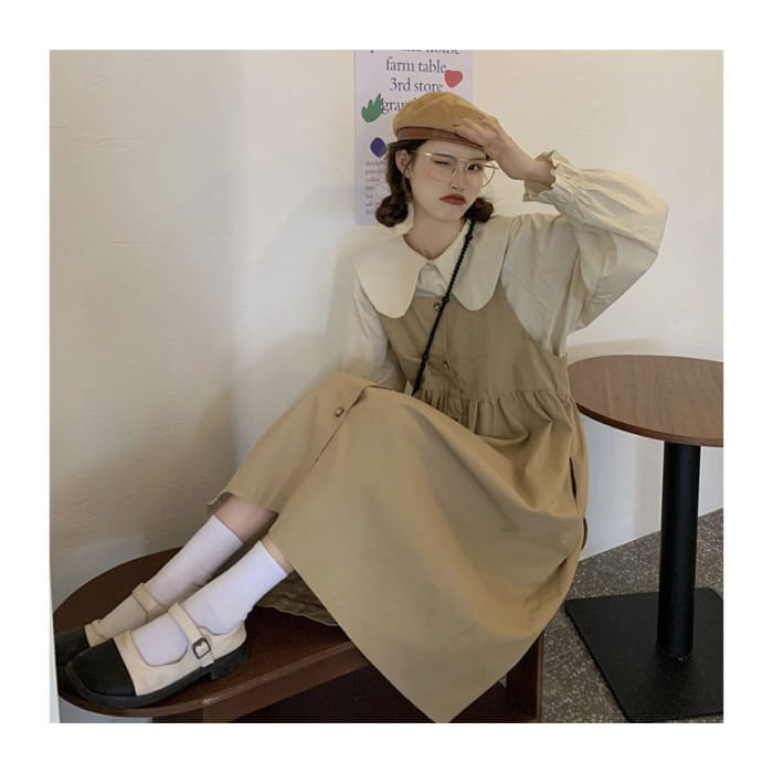 Long-Sleeve Collared Plain Blouse / Square-Neck Plain Midi Overall Dress