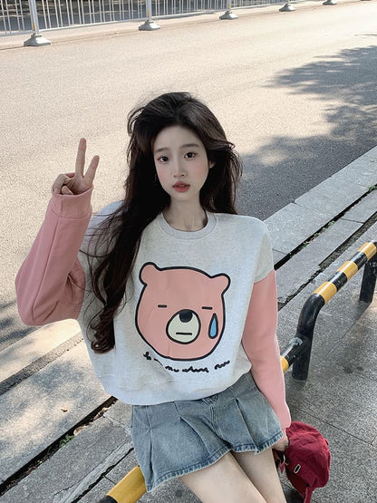Long-Sleeve Crew Neck Bear Print Paneled Sweatshirt