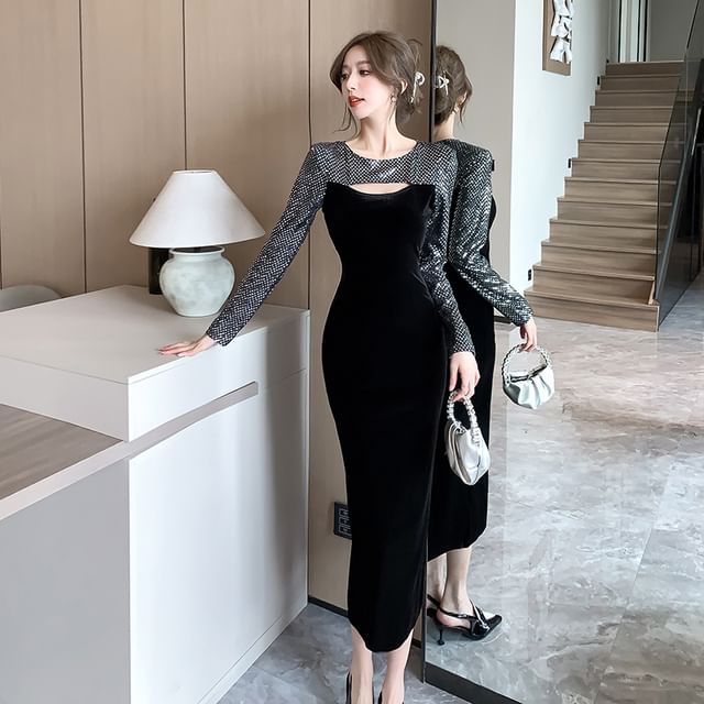 Long-Sleeve Crew Neck Sequined Cutout Bodycon Dress (Various Designs)