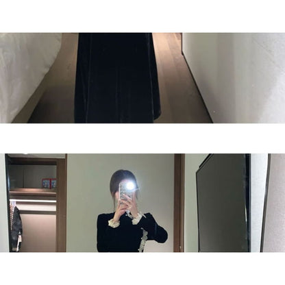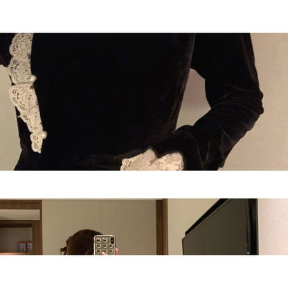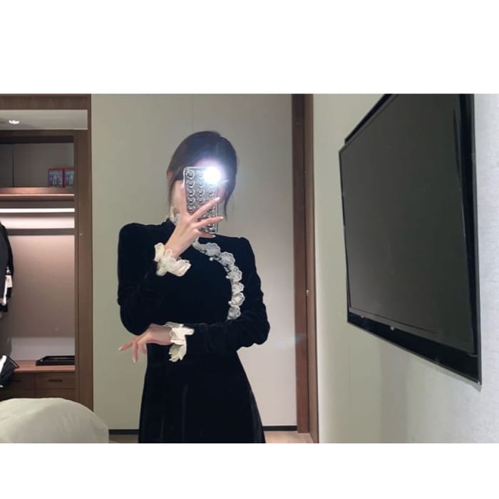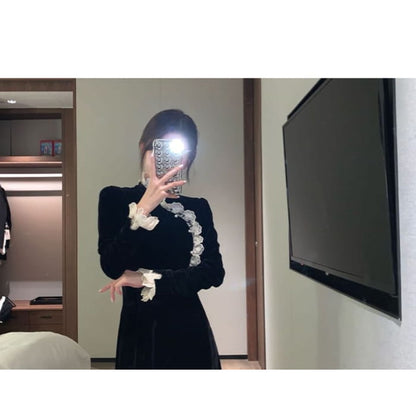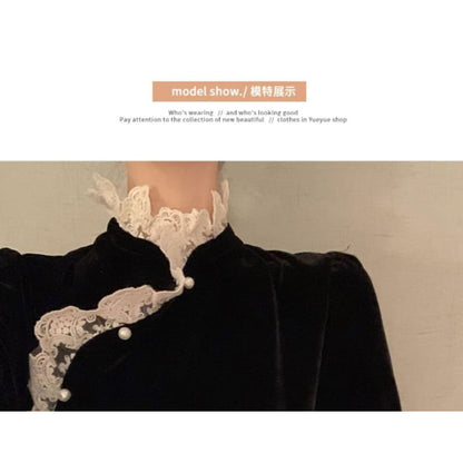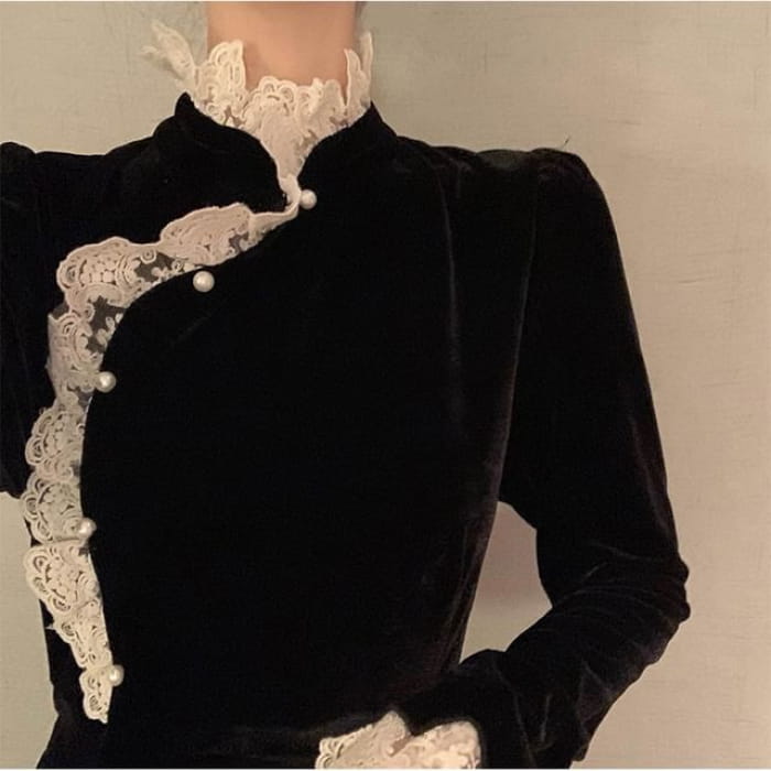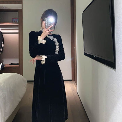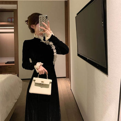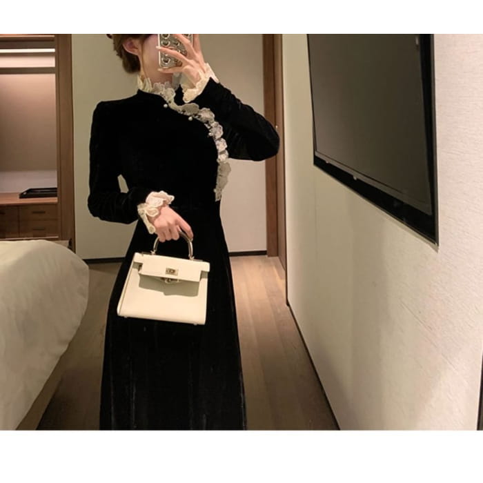 Long-Sleeve Lace Trim Velvet Midi Qipao Dress
