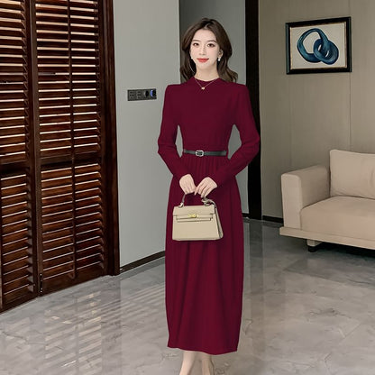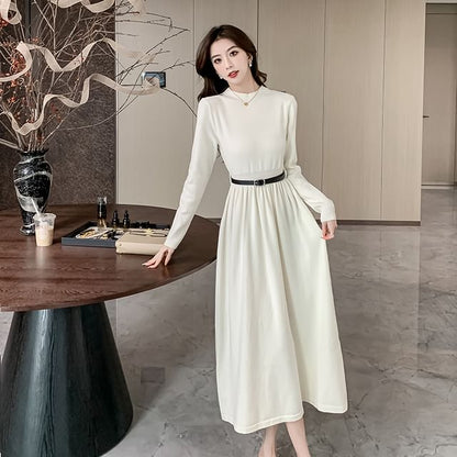 Long-Sleeve Mock Neck Plain Cutout Back Midi A-Line Knit Dress